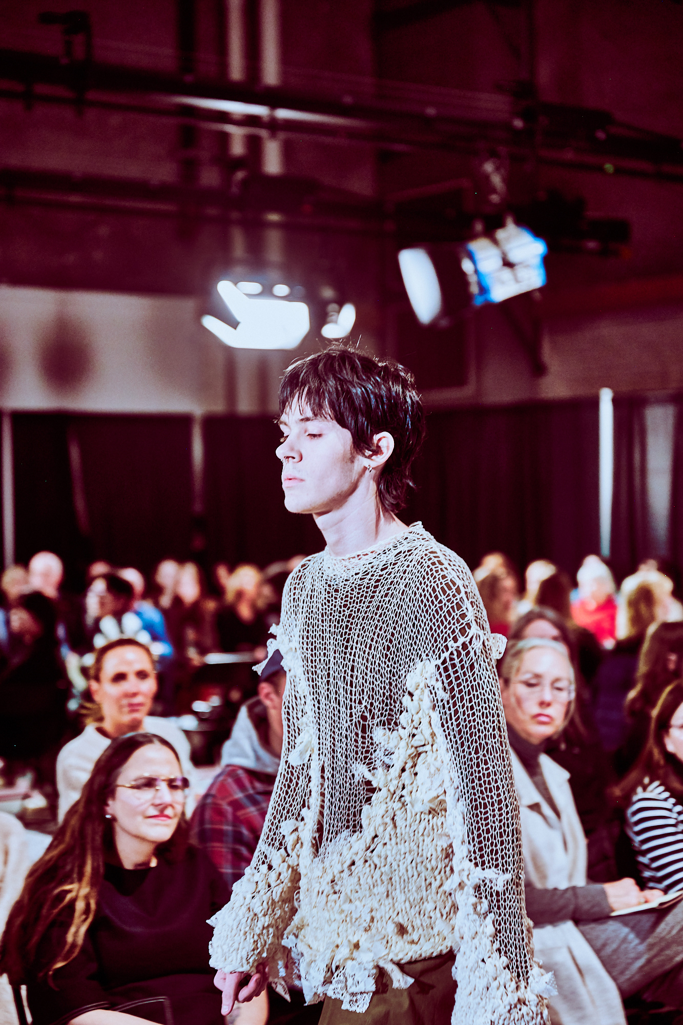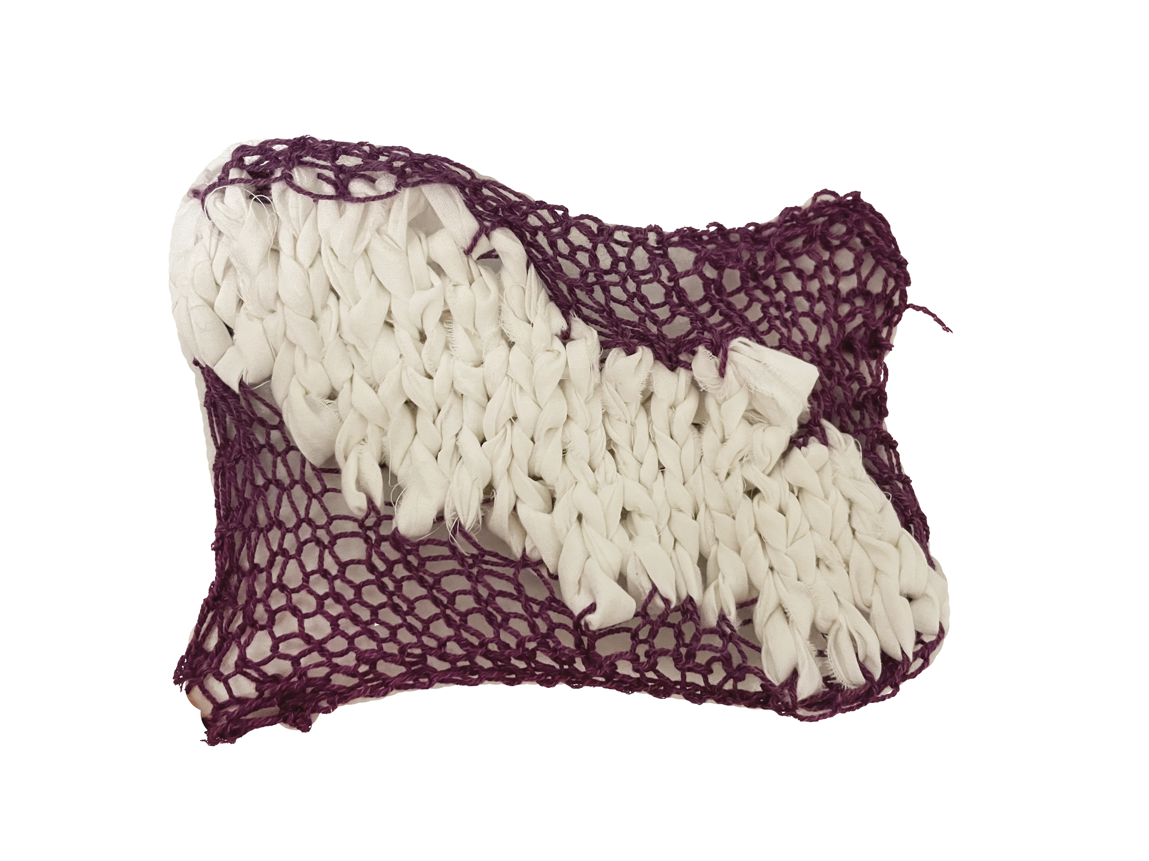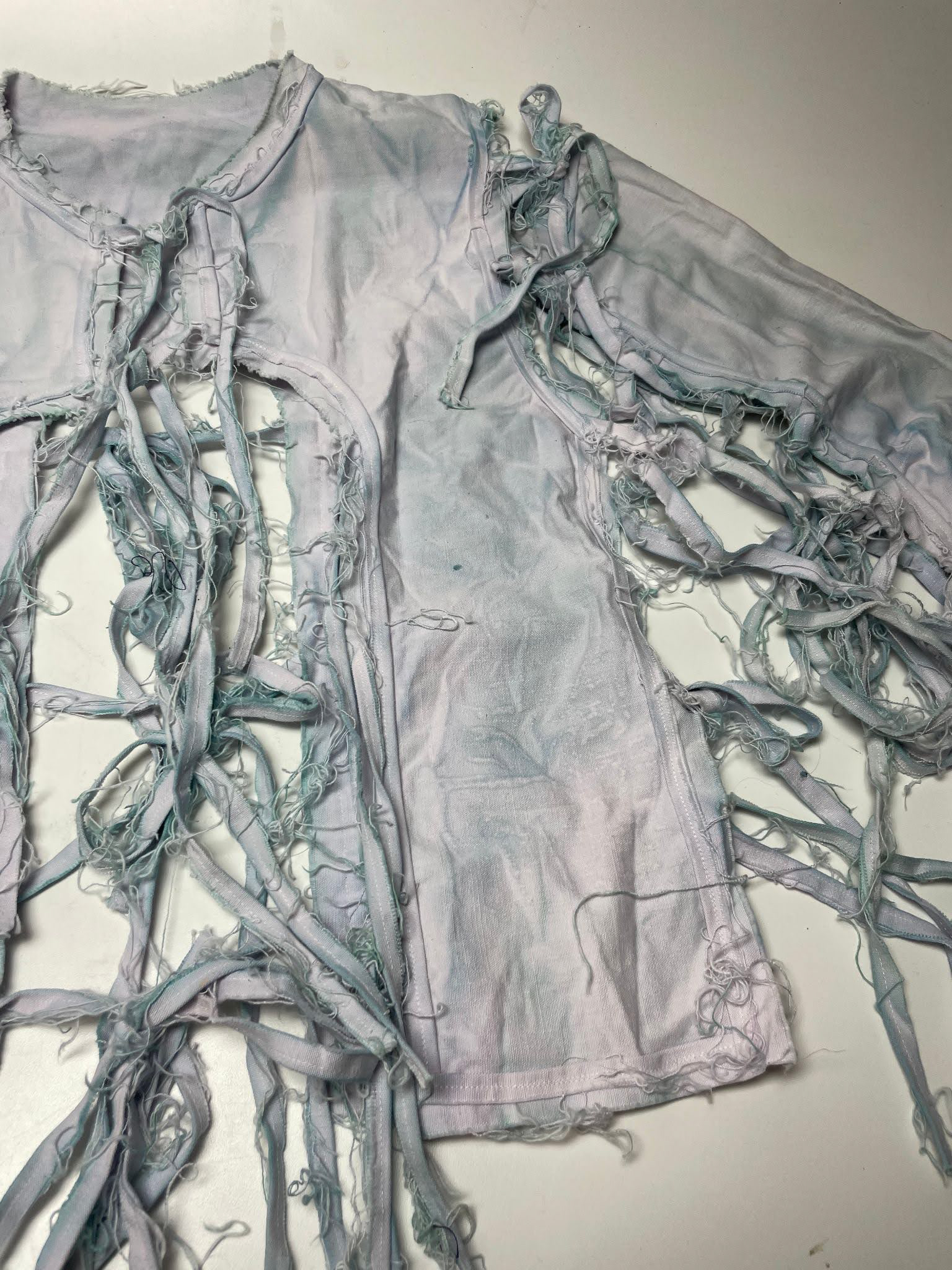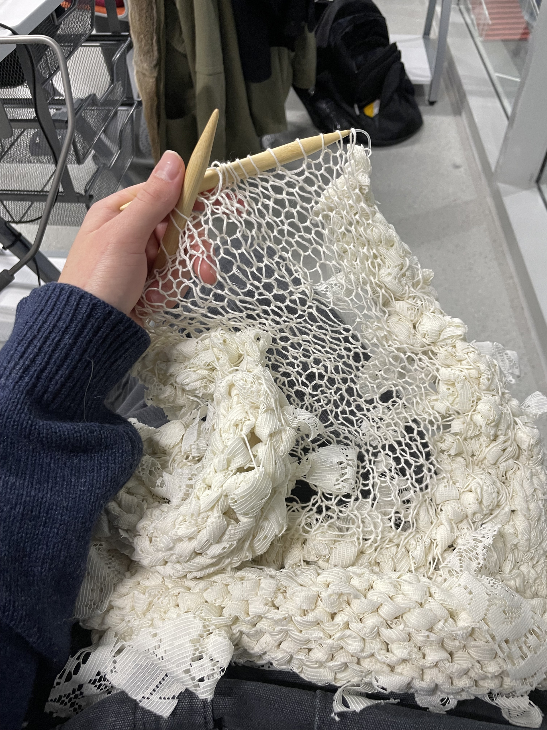 The sweater was knit in four panels over many hours using cut strips of old lace tablecloth and linen yarn together in a pattern designed to look like the material is rotting away.