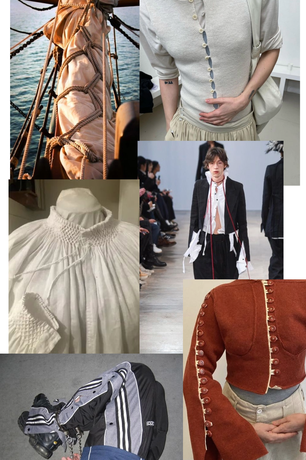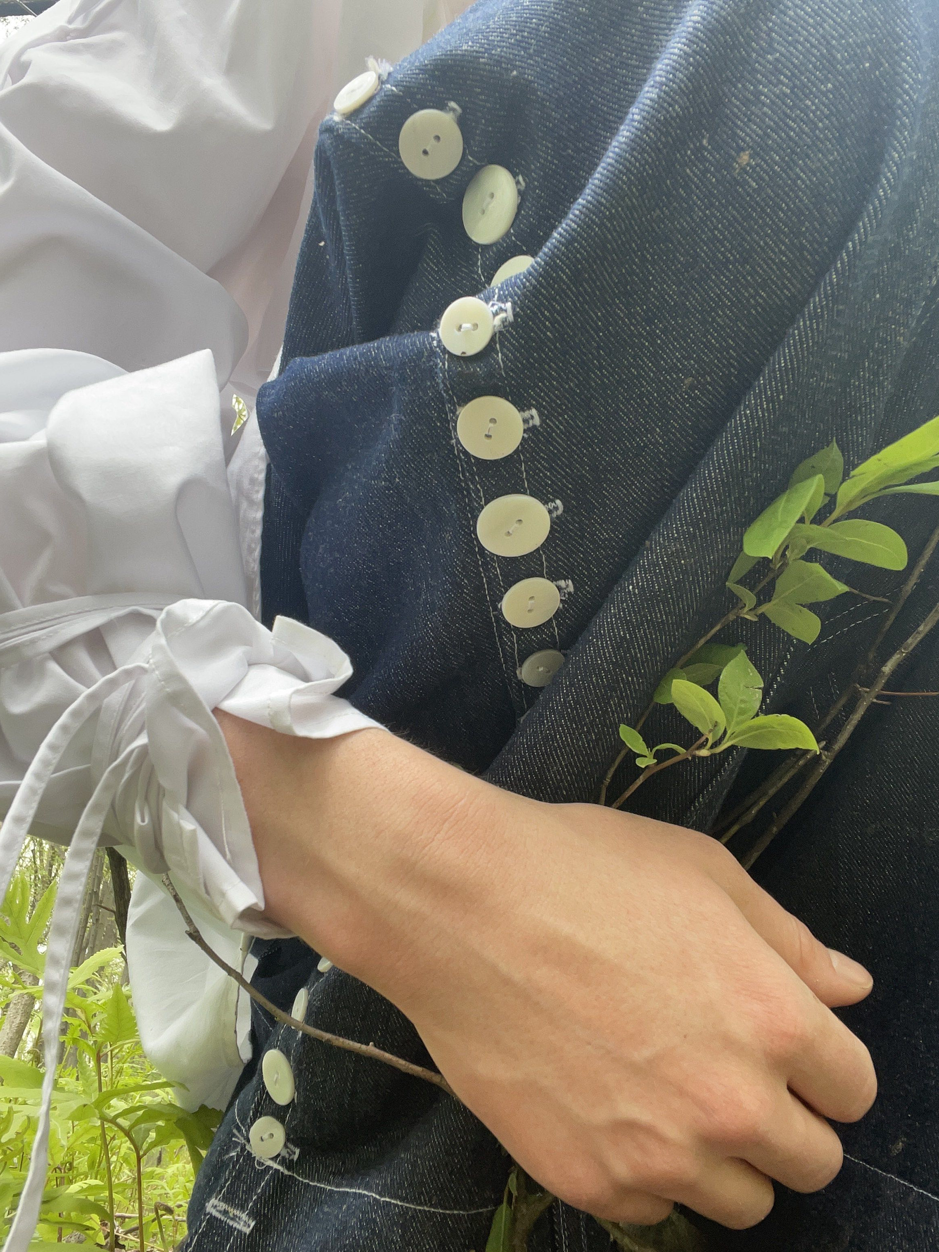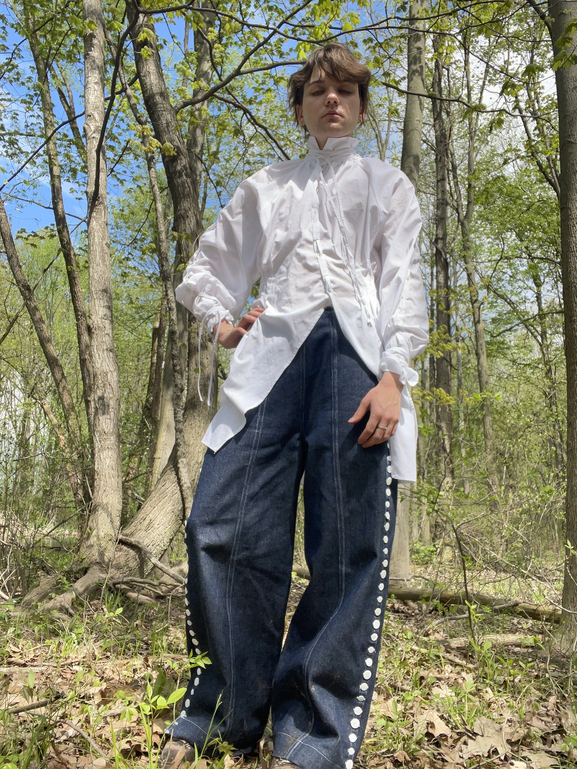 For the Beyond Fashion show this year, I wanted to focus on closures in clothing. I crafted pants that can be opened up completely with a row of buttons on each side, and a shirt laced up along the top of each arm and the front, and then secured with ties on the neck and wrists.