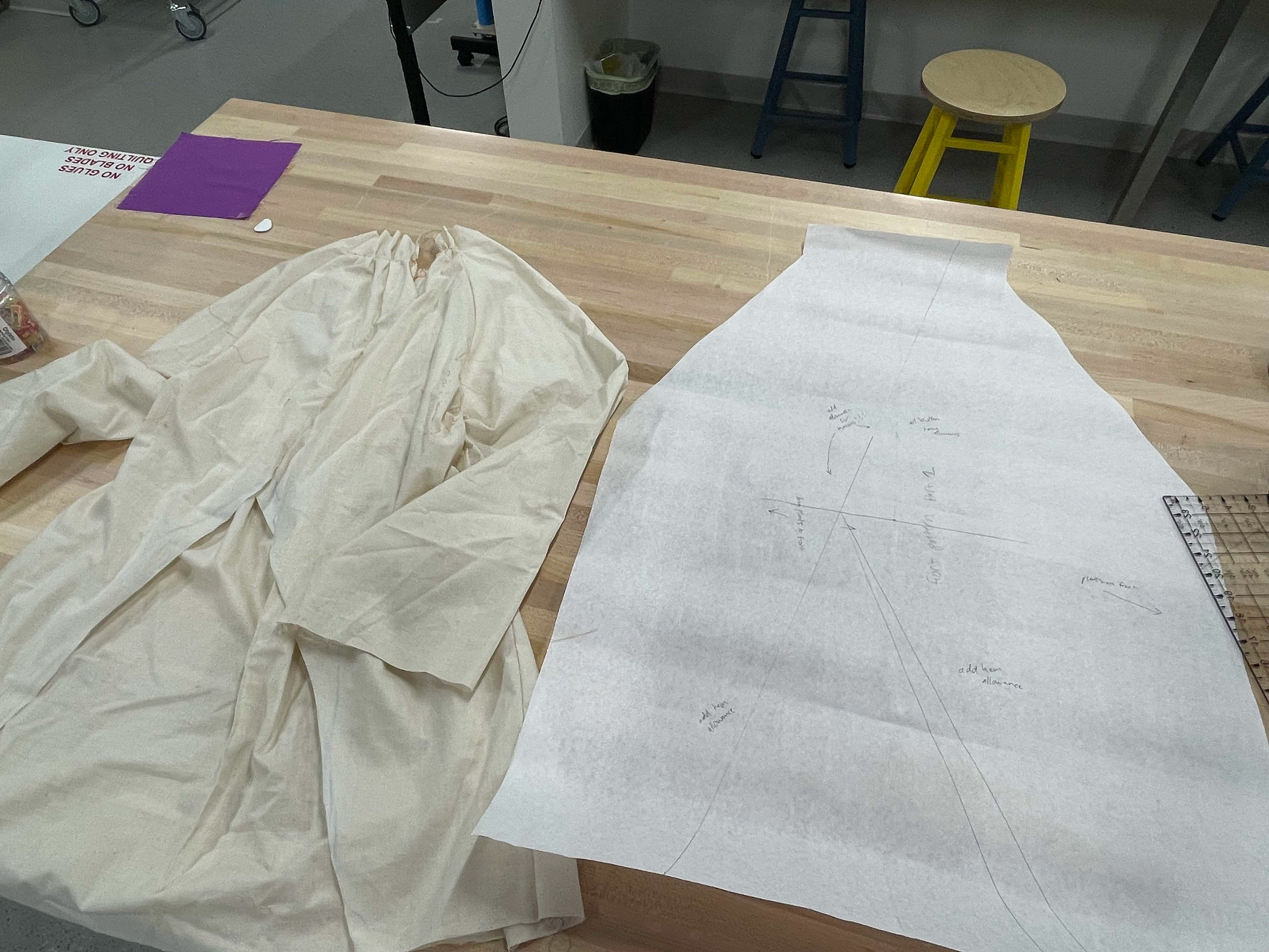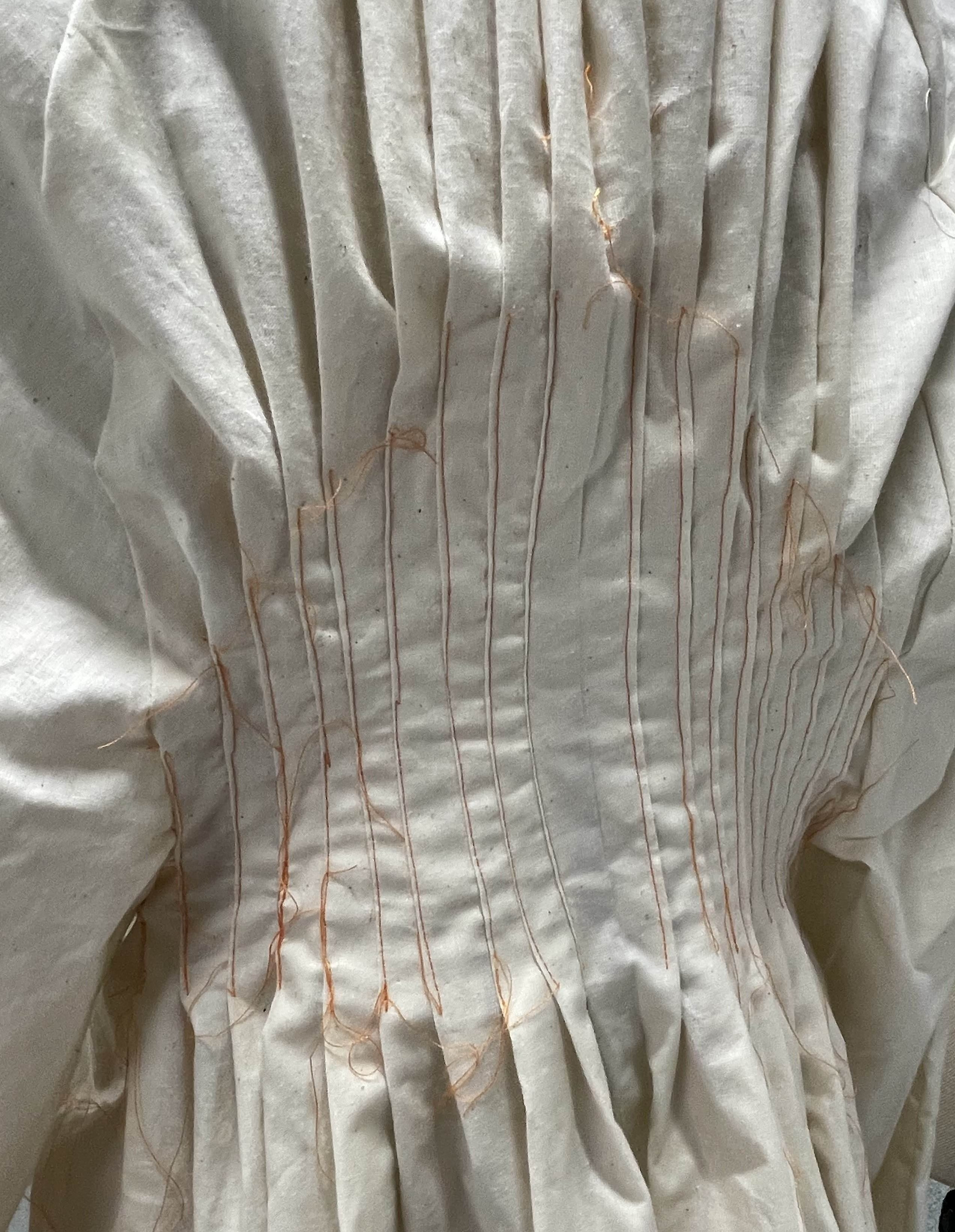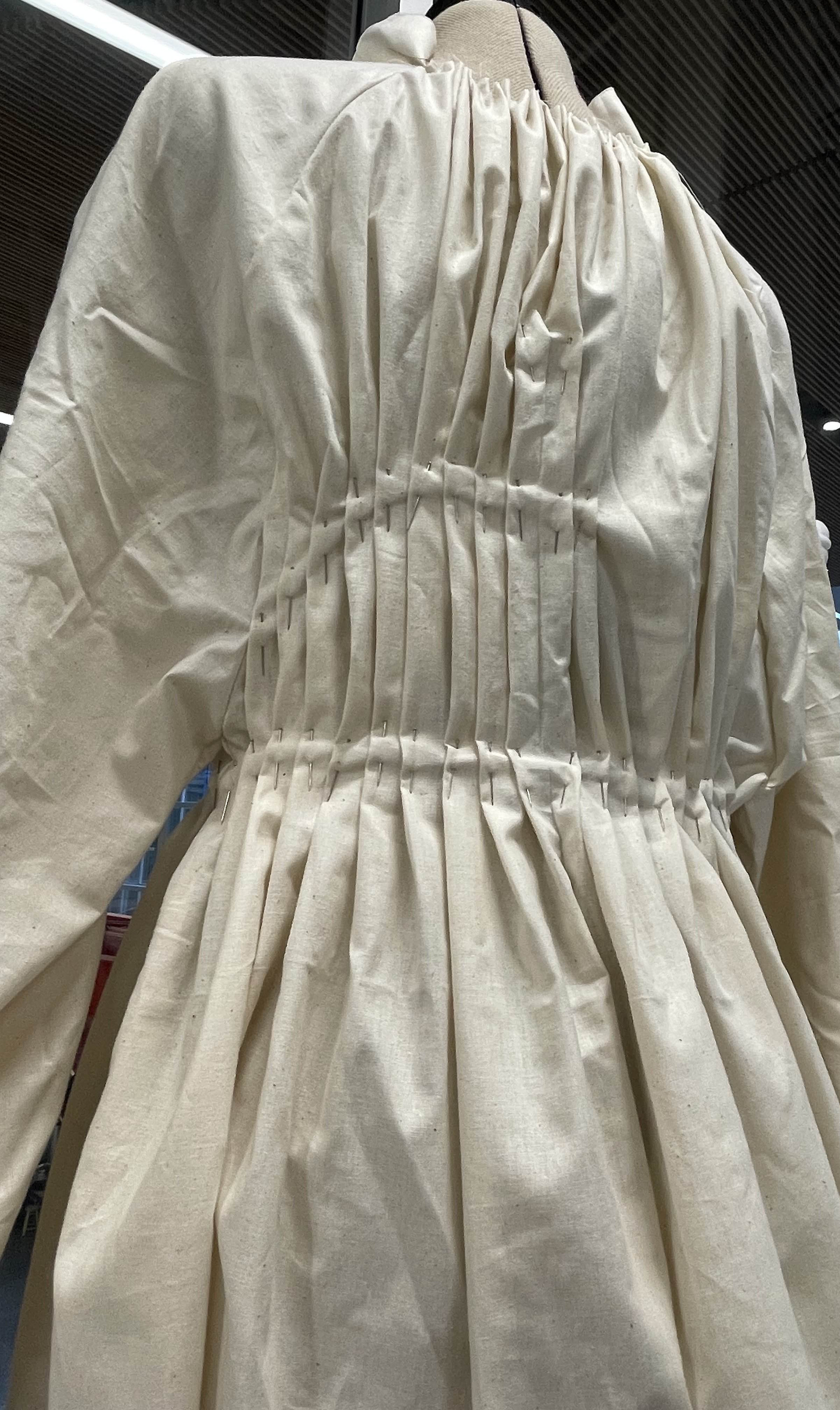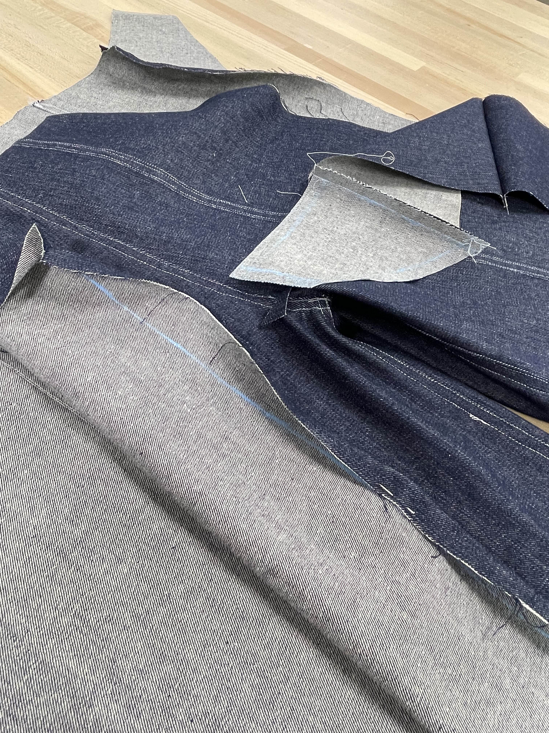 For the Beyond Fashion show this year, I wanted to focus on closures in clothing. I crafted pants that can be opened up completely with a row of buttons on each side, and a shirt laced up along the top of each arm and the front, and then secured with ties on the neck and wrists.
